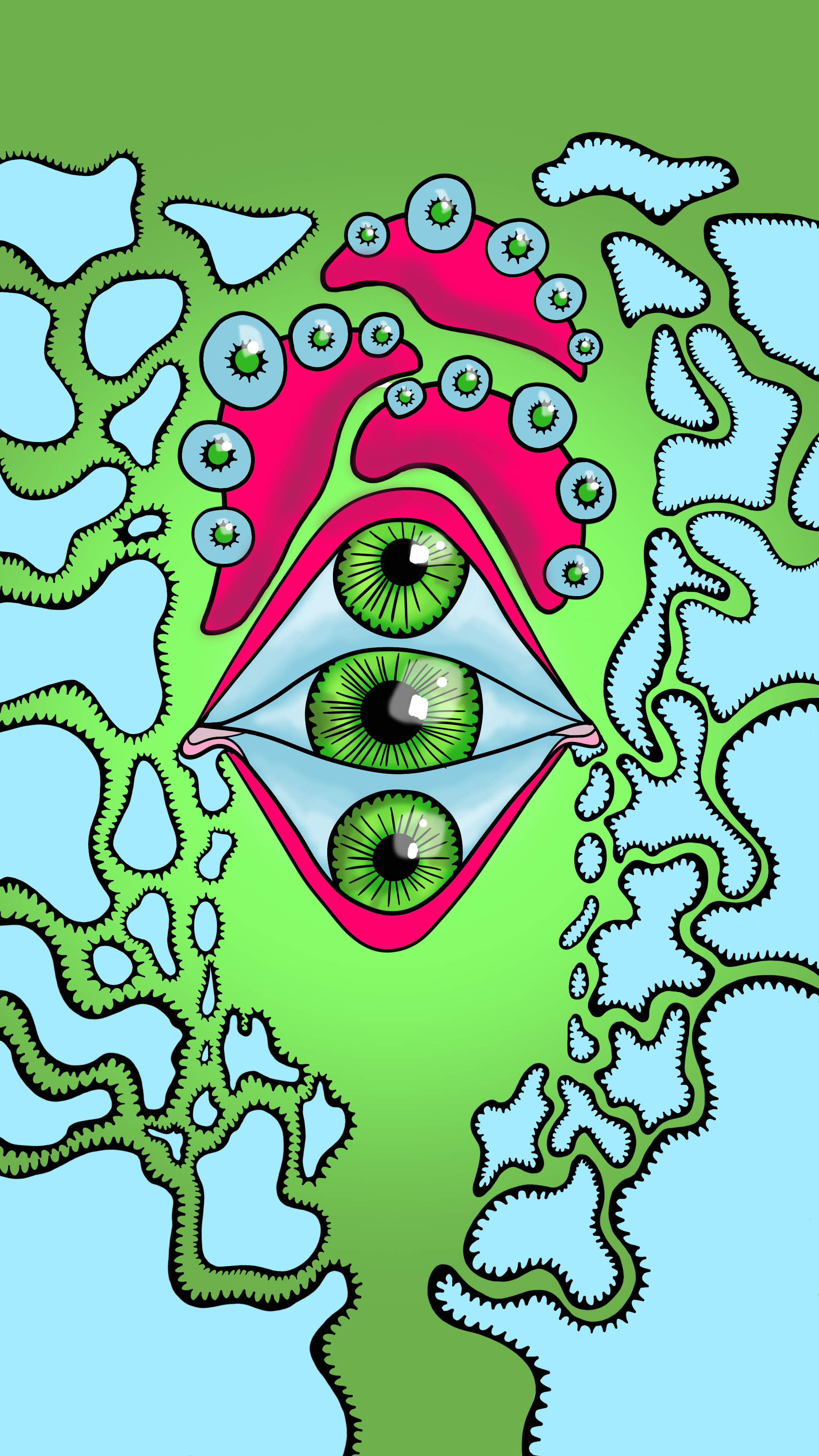 Mesmerising hybrid of pufferfish, jellyfish, and human. Its turquoise scales rise into, defensive spikes when threatened. Long, ribbon-like tentacles trail behind it, drifting gracefully in the current, each movement simultaneously hypnotic and menacing. On land, it walks upright with a strange, fluid elegance. The centerpiece of its form is a large, flower-shaped mouth—a blossoming suction ring detailed with thin, petal-like teeth. This creature embodies the extremes of adaptation in the deep, where survival can sculpt life into astonishingly alien shapes.